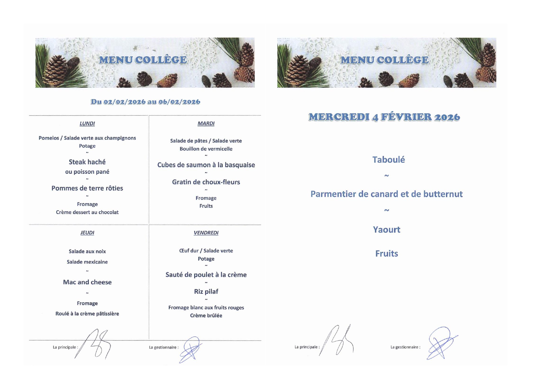 Menus de la semaine du 2 au 6 février 2026