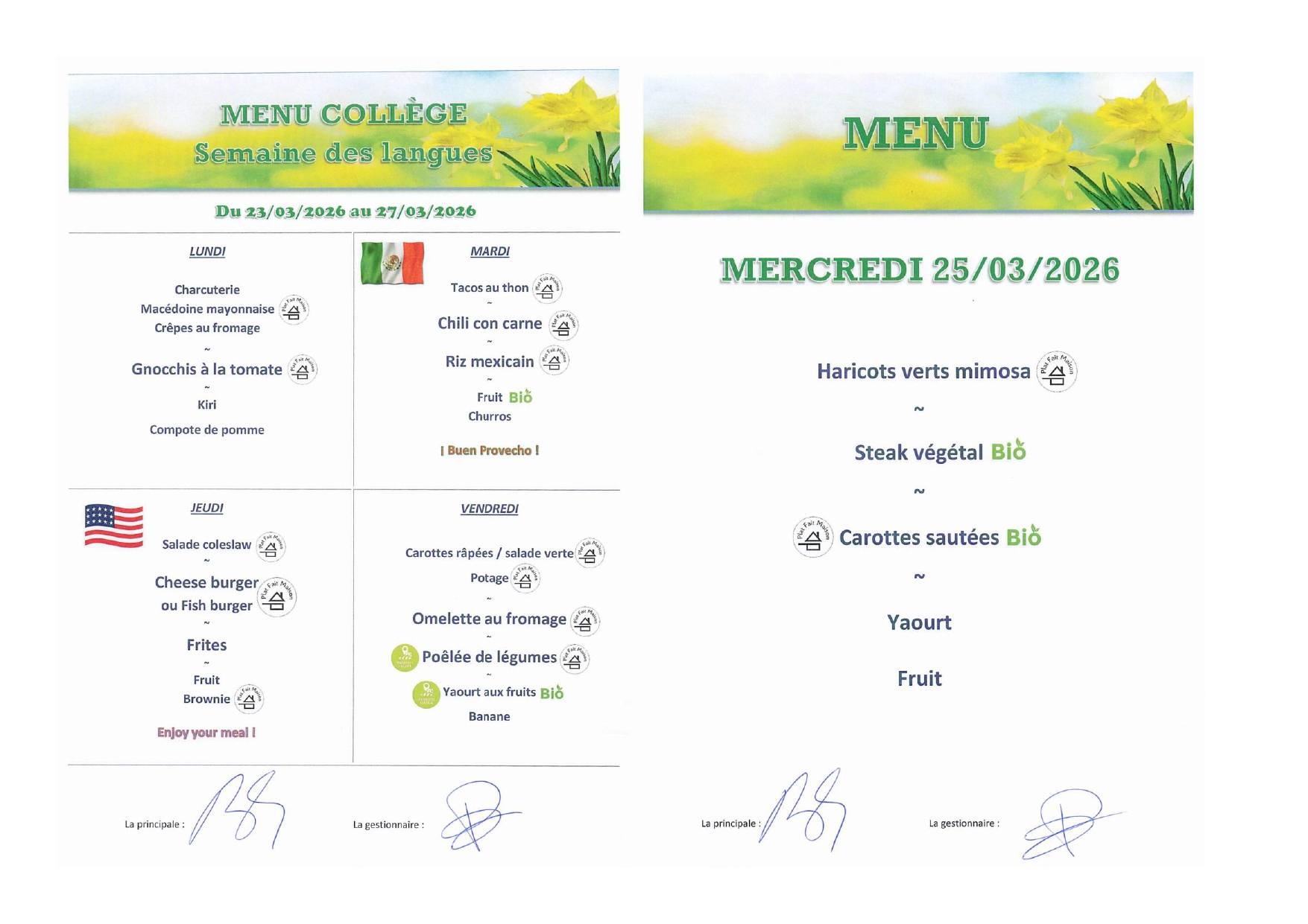 Menus de la semaine du 23 au 27 mars 2026
