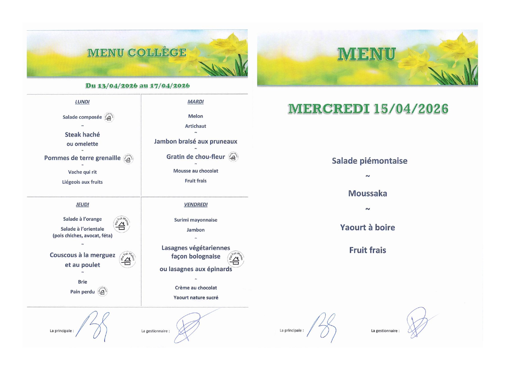 Menus de la semaine du 13 au 17 avril 2026